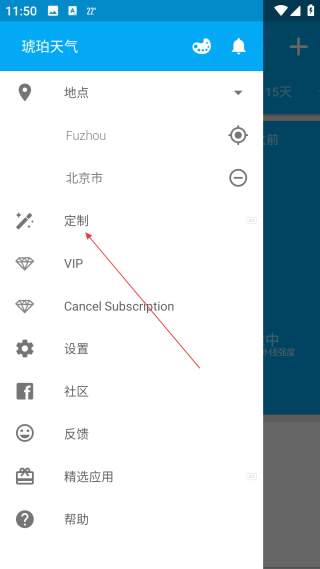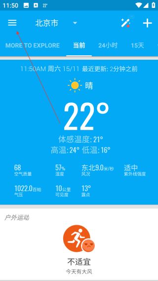 1、在天气应用界面,点击【左上角菜单按钮】,进入功能菜单界面。