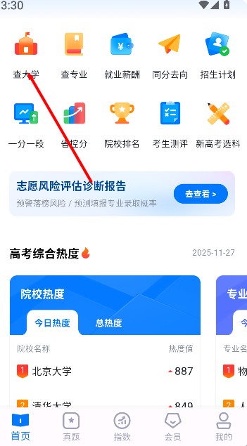 1、在首页找到并点击“查大学”的入口,进入高校查询功能页面后,即可浏览可供选择的学校列表。