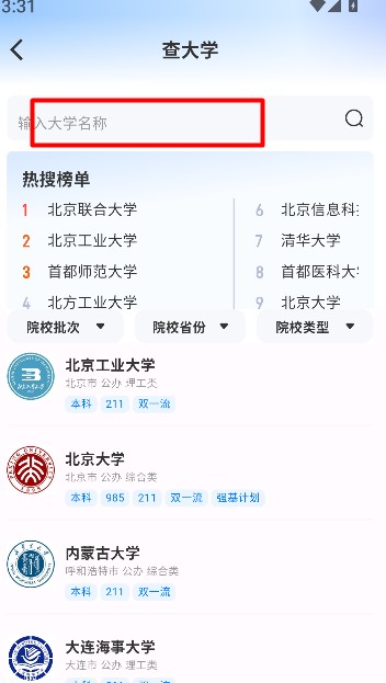 2、在搜索框中输入目标大学的名称,系统会迅速匹配并展示相关的院校信息。
