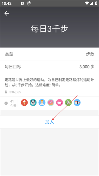 4、挑选目标(例如“每日3千步”),进入目标详情页面后点击【加入】按钮,就能添加这个健走目标并开启进度跟踪。