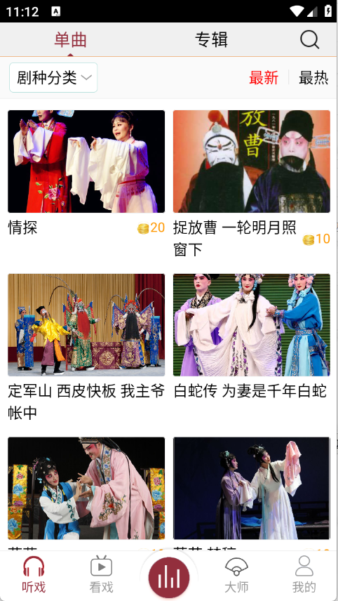 2、进入之后,底部栏中将戏曲按照类型、戏曲大师进行分类。