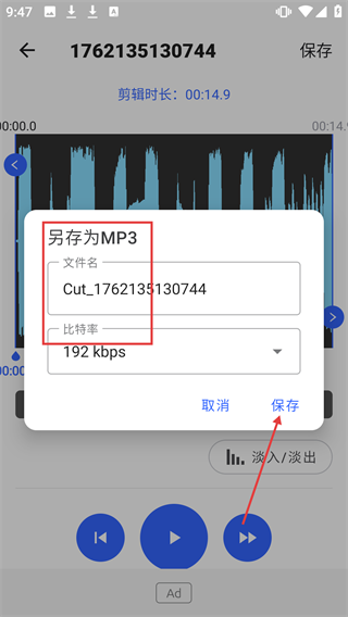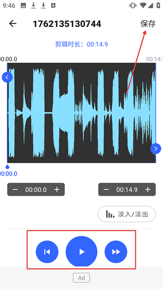 3、进入音频剪辑界面后,完成剪辑操作,再点击界面右上角的“保存”按钮。