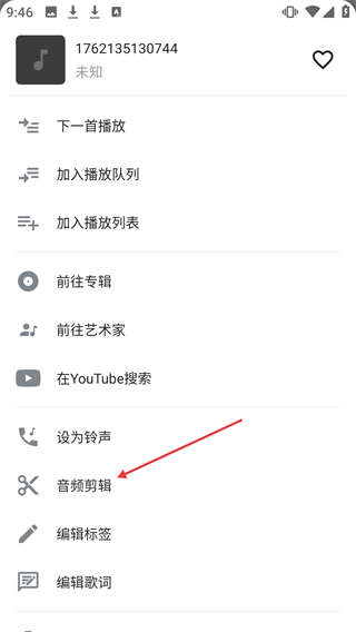 2、打开曲目操作菜单,选择“音频剪辑”选项,即可进入剪辑界面。