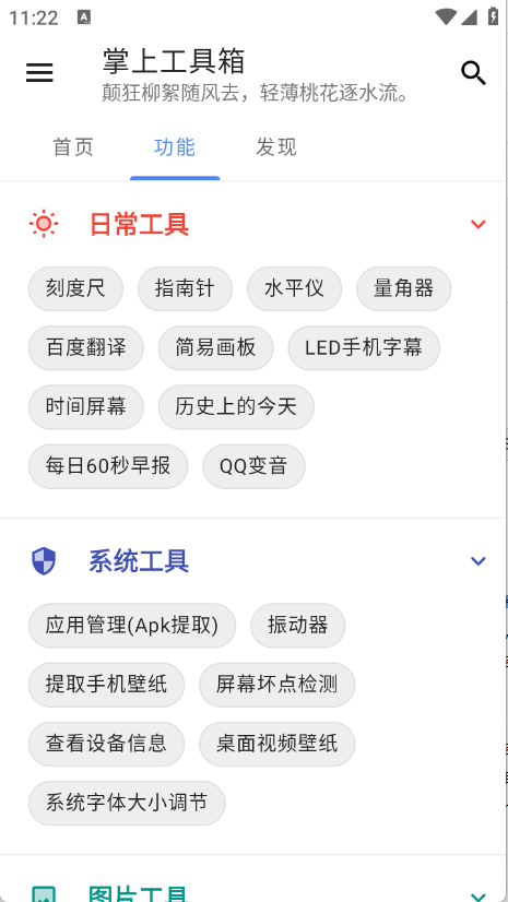 掌上工具箱,汇集了很多的实用工具,不管是日常工具、系统工具还是图片工具等类型都有,每一款工具都是免费使用的,直接点开就可以使用,可以将常用的工具进行收藏,随时都可以找到需要的工具。