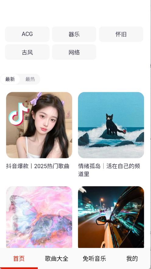 2进入首页后,能看到丰富的音乐资源,涵盖怀旧、古风、网络等多种类型。