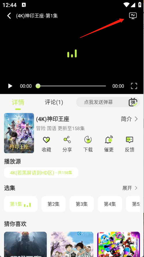 1打开你想投屏观看的影视作品,进入播放页面后,找到并点击界面右上角的电视图标。