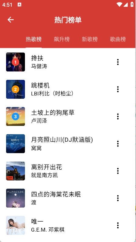 3、排行榜页面包含了热歌榜、飙升榜以及新歌榜等。
