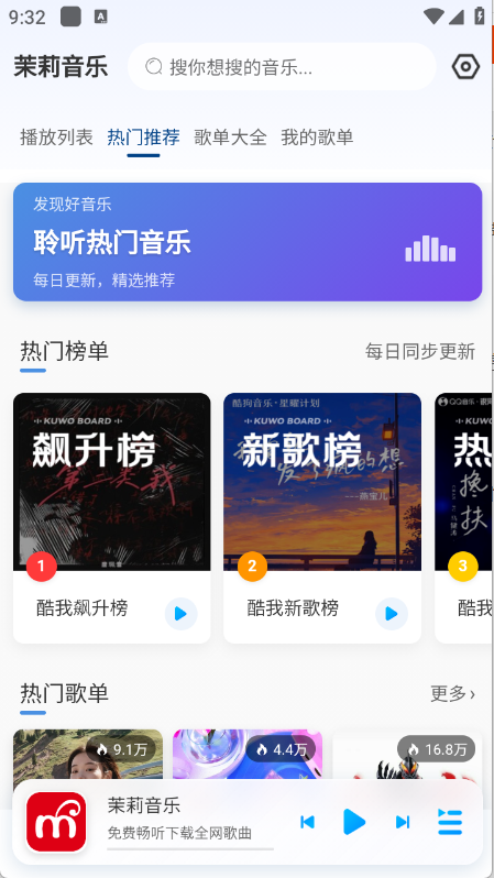 茉莉音乐拥有丰富多样的音乐资源,无论是最新上线的歌曲还是经典老歌都能在这里找到。平台上的所有音乐均支持免费收听,用户可以把自己钟爱的音乐收藏起来。此外,茉莉音乐每天都会推荐当下热门的音乐内容,并且对音乐进行了细致的分类,同时提供多种音质选项,让大家能够随时随地轻松享受优质的音乐体验。