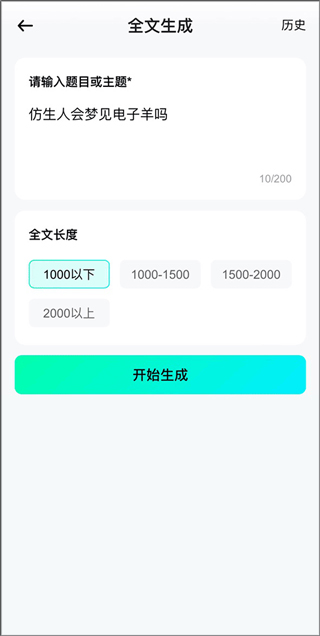 2、输入题目与主题,选择全文长度,点击“开始生成”。