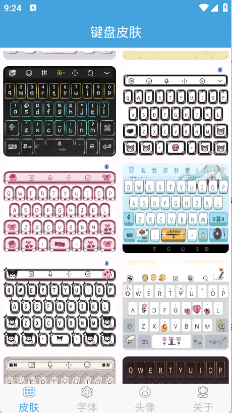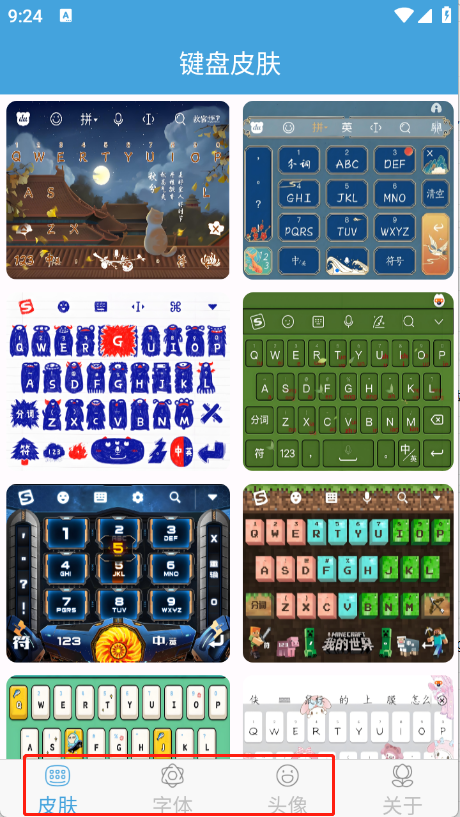 2、顶部栏中汇集了键盘皮肤、字体以及头像。