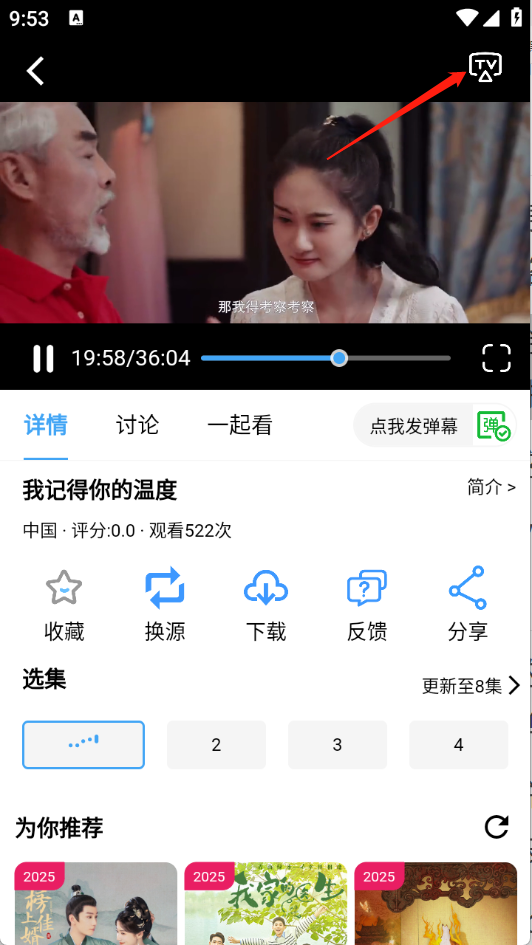 1、进入首页,找到并点开想看的影视进入播放页,点击右上角的“TV”。