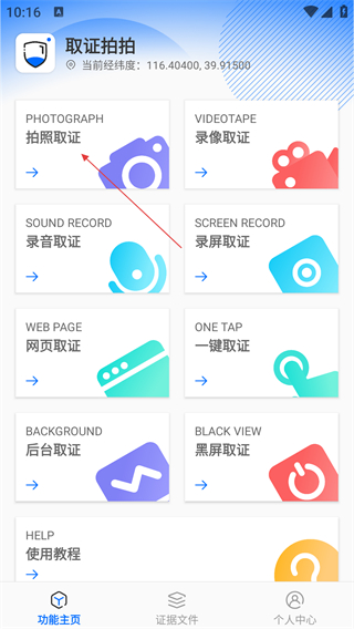 2在应用的主页面上,找到并点击“拍照取证”这一功能选项,随后系统会跳转至与拍照操作相关的界面。