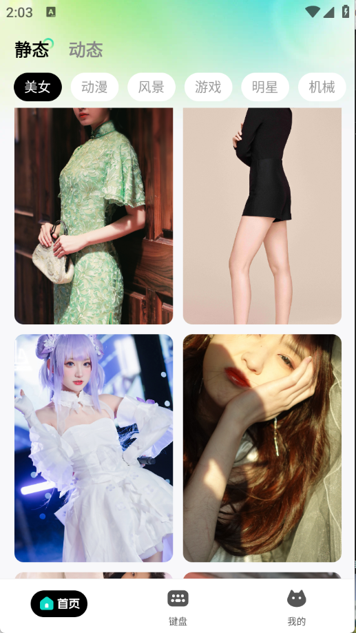 2进入首页后,能看到动漫类、风景类、明星类等多种类型的壁纸资源。