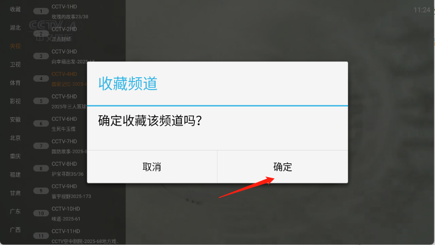 4、长按想要收藏的电视频道,在弹出的对话框中点击“确定”按钮,就能完成收藏操作。