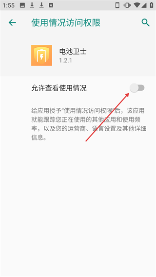 4、开启【允许查看使用情况】开关可授予电池卫士相应权限,以便其进行耗电优化。