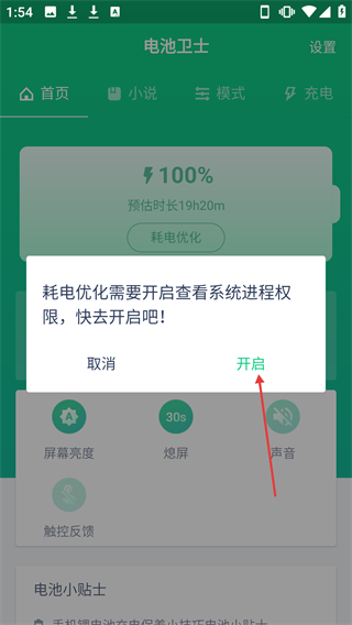 2、在耗电优化权限提示中点击【开启】可进入权限设置页面。
