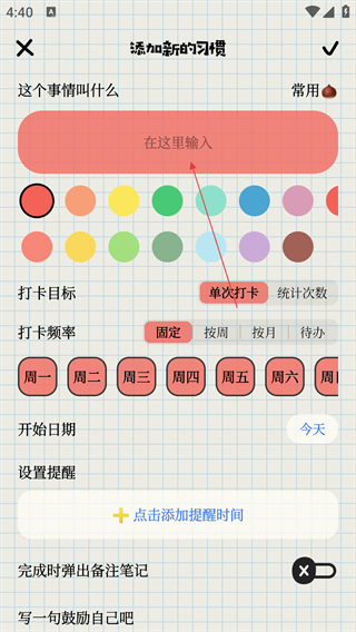 3、在“添加新的习惯”界面,在输入框填写习惯名称,选择颜色、打卡规则等信息。
