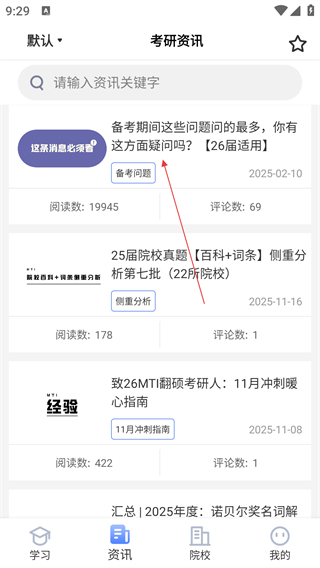3、在考研资讯页面,选择目标资讯条目(如备考问题相关内容),点击可进入详情页查看内容。