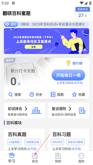 2、进入主界面后,点击底部【资讯】选项,可切换至考研资讯页面查看相关内容。