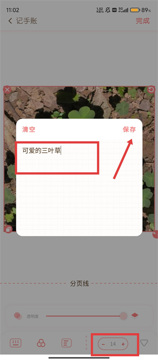 3、添加文字时,输入内容如【可爱的三叶草】,点击【保存】,还能调整字体大小,让文字样式更丰富呀。