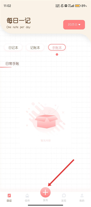 1、打开随笔日记,选择【手账本】分类,点击底部发布按钮,即可开始记录手账呢。