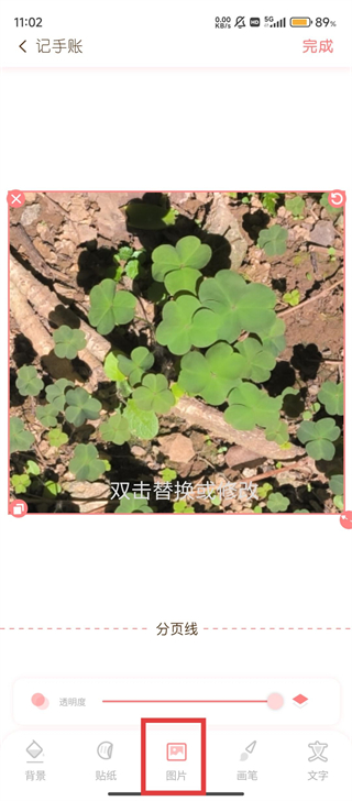 2、进入记手账界面,点击【图片】功能添加图片,双击图片可进行替换或修改,让手账更生动哦。