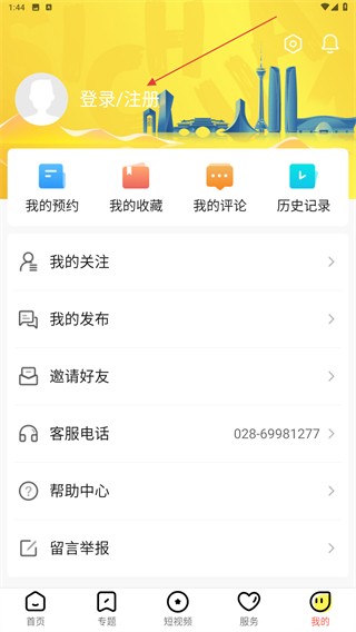 2、进入个人中心的界面内,点击上方登录/注册的区域位置。