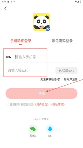 3、在手机验证登录的界面内,输入手机号、验证码再点击登录。