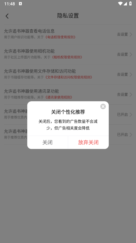 4、将“允许追书喊谁呢器根据个性化行为推荐广告”按钮关闭。