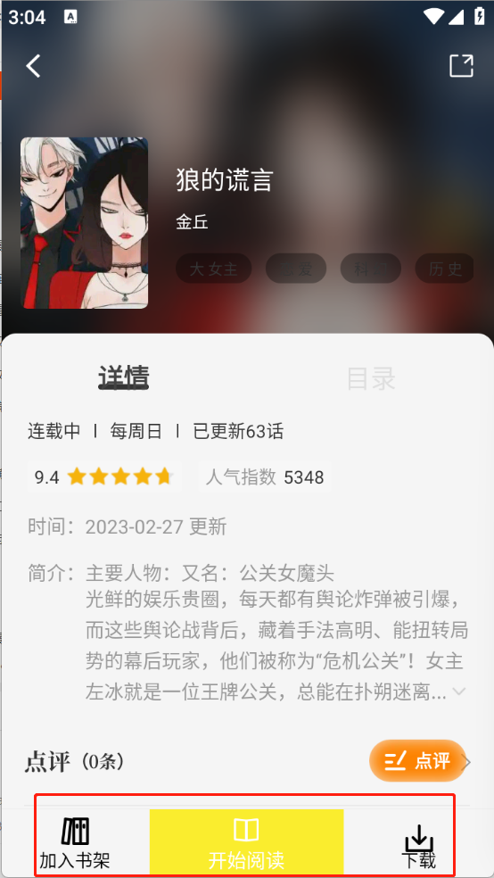 4、找到并点击想看的漫画,可以加入书架,也可以开启阅读或者。