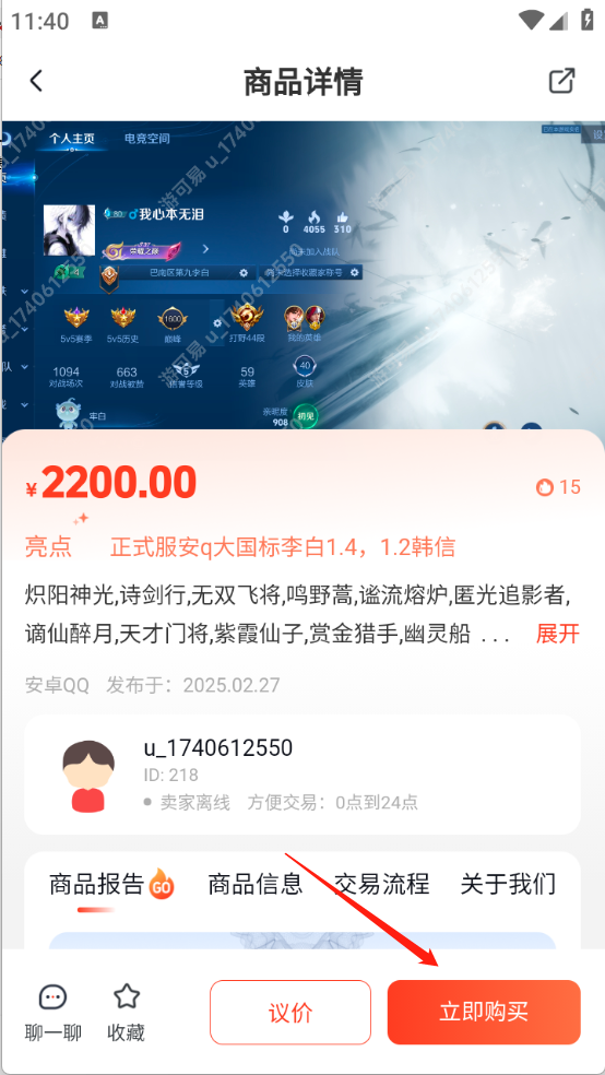 3、用户可直接点击所需游戏账号进入详情页,随后点击“立即购买”按钮即可完成操作。