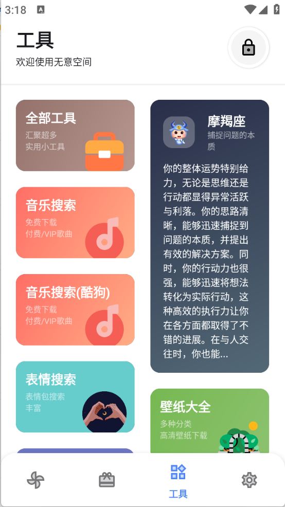 5、“工具”页面汇集了各类在线工具,涵盖脑阔在线音乐、壁纸大全等。