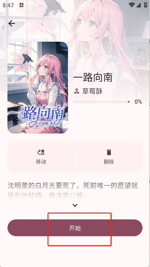 3、用户点开想看的小说进入详情页,点击“开始”。
