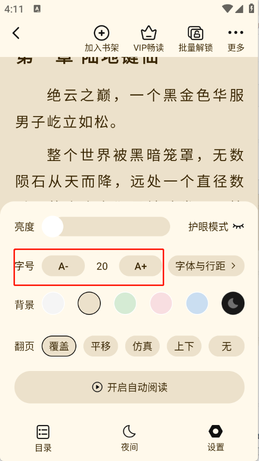 1、进入到小说阅读页面之后,点击“设置”。