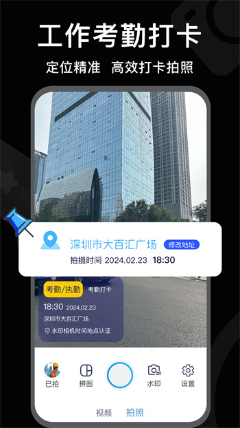 3、办公与外勤打卡时必不可少的水印相机,即便直接拍摄也能自动添加水印。