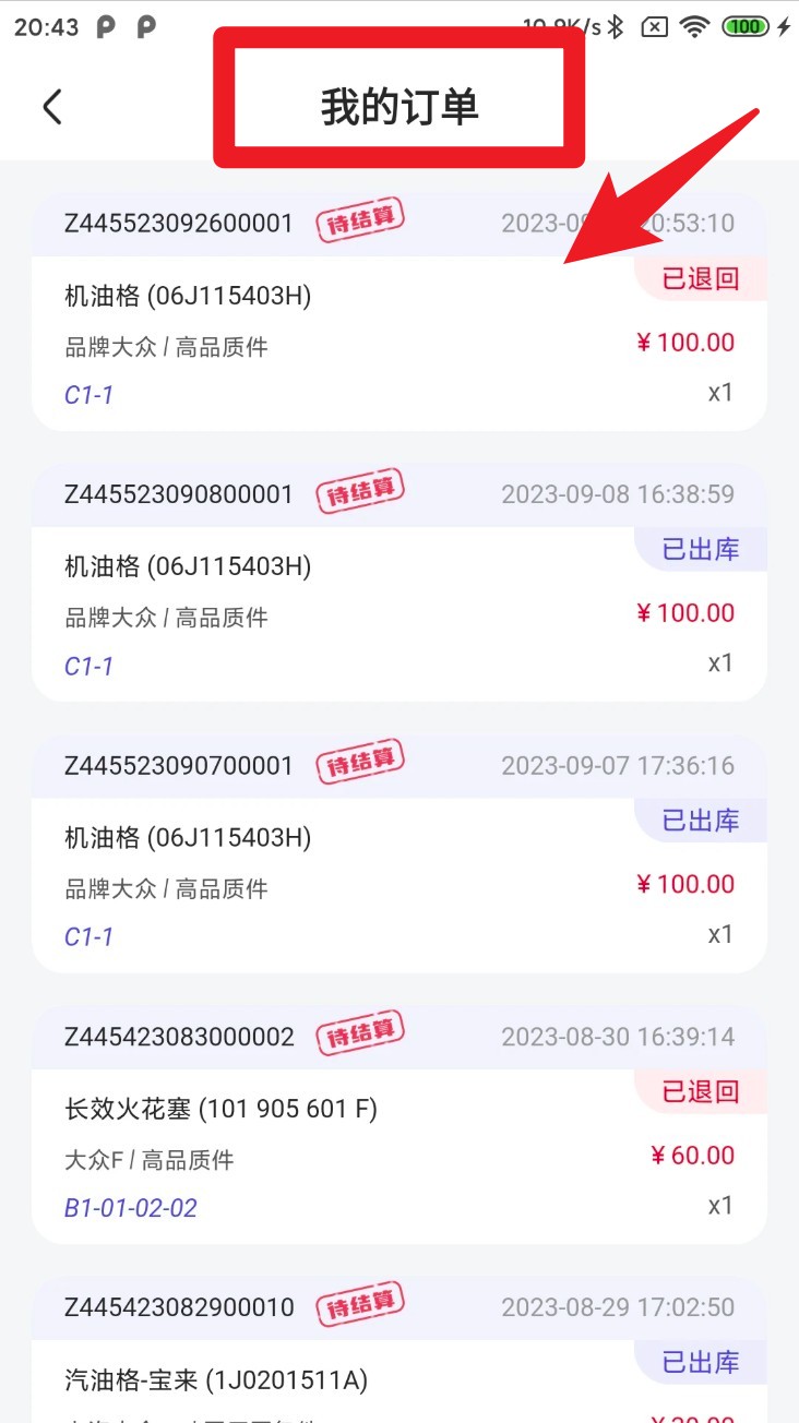 4进入“我的订单”页面,能够查询所有配件的出库与退货情况,同时可以查看相关配件的品牌信息、单个价格以及当前的状态标识。