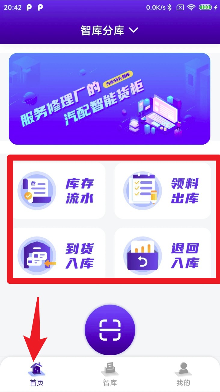 2. 登录成功进入首页后,点击相应图标即可使用“库存流水”“领料出库”“到货入库”等功能模块。