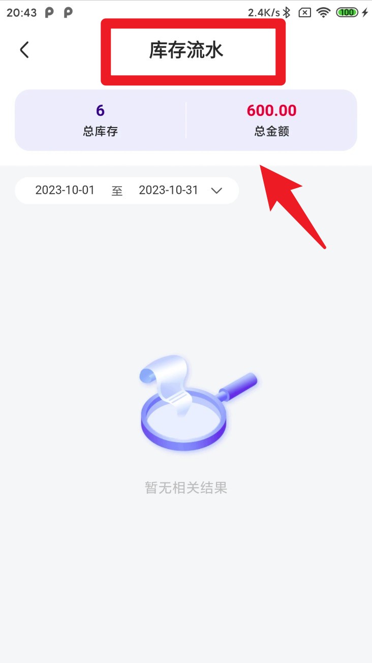 3. 如需查看库存详情,点击“库存流水”进入记录页面,可借助时间范围筛选库存及金额相关信息。