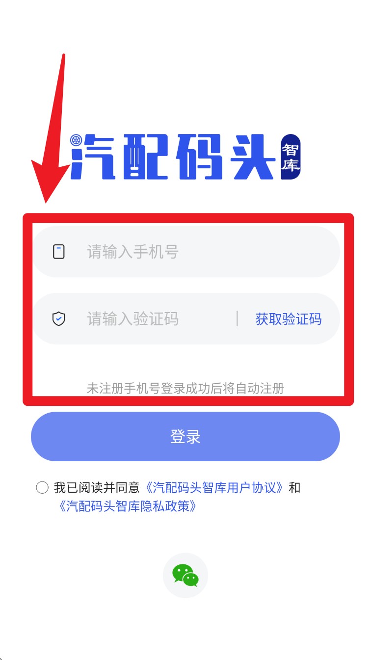 1. 启动汽配码头智库应用程序,初次使用时需输入手机号码并获取验证码进行登录,未注册的用户会由系统自动完成注册步骤。
