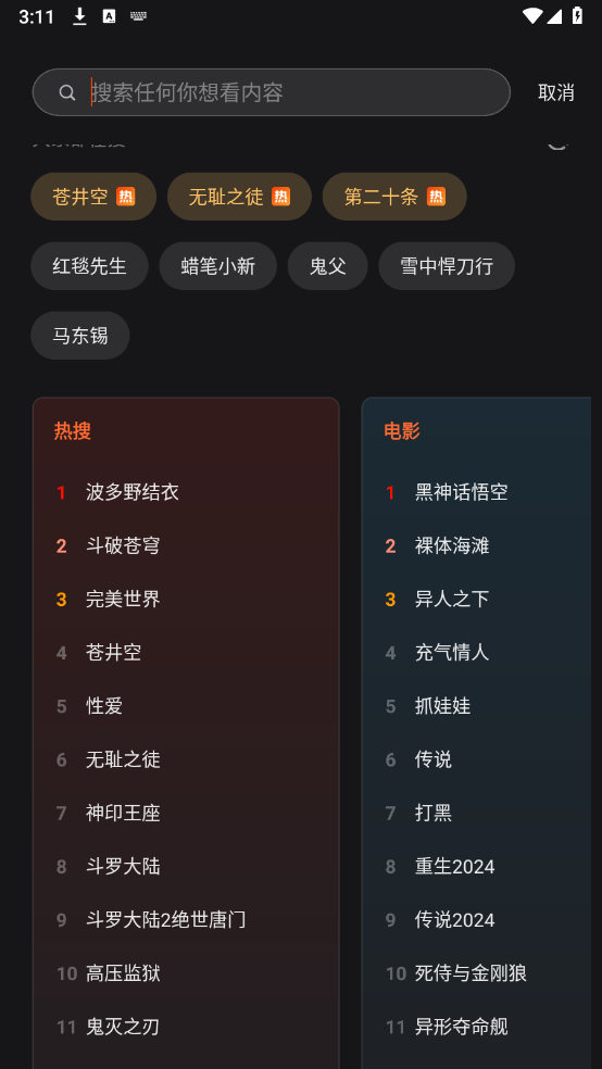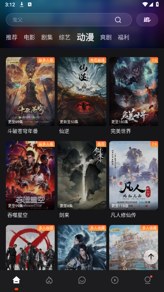 2进入应用的主界面后,各类影视内容一目了然,涵盖了电影、综艺节目以及动漫等多种不同类型的剧集。