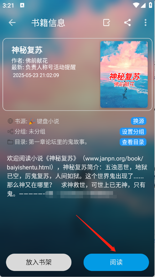 4、点击想看的小说进入详情页面,点击“阅读”。