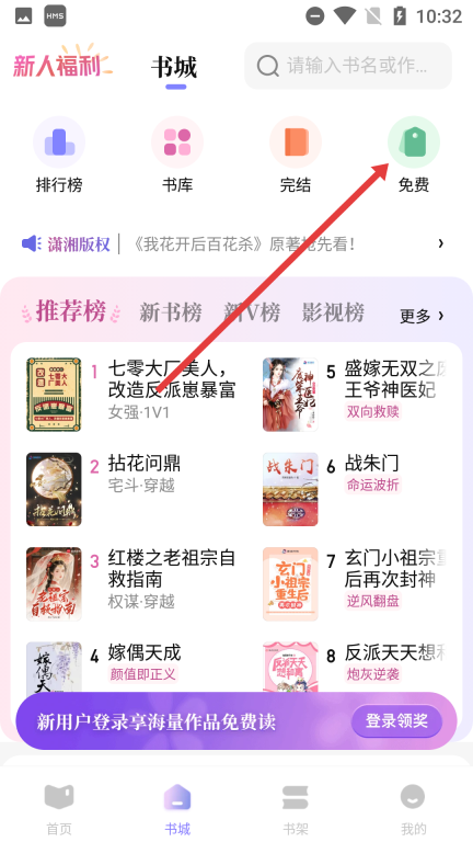 2在书城界面,找到并点击【免费】选项,就可以进入免费专区页面了。