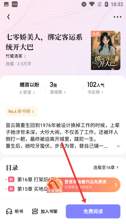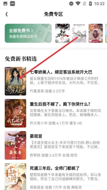 3在免费阅读区域,挑选你想阅读的书籍,例如《七零娇美人,绑定客运系统开大巴》,然后点击该书的封面或标题进入其详情页面。