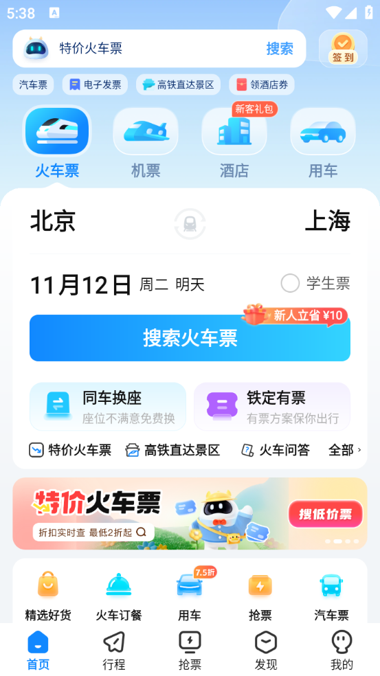 高铁管家App提供火车票、机票、酒店、用车等旅游产品预订: