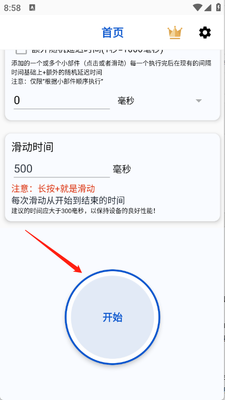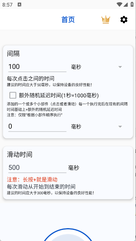 3、进入到首页之后,可以先行设置点击间隔时间,延迟时间,滑动时间。