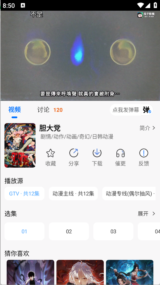 6、点开想看的动漫后就能播放,还可以观看弹幕、选择集数以及进行分享等操作。