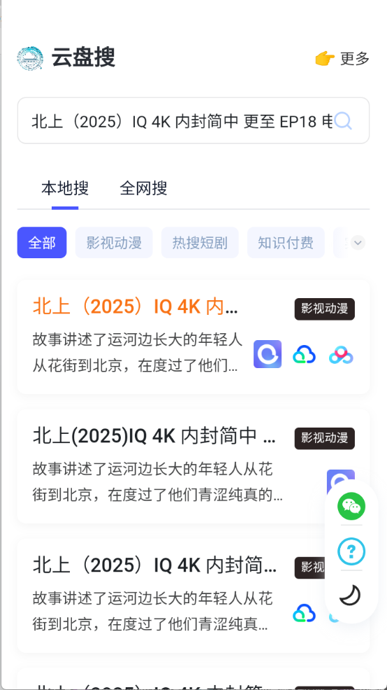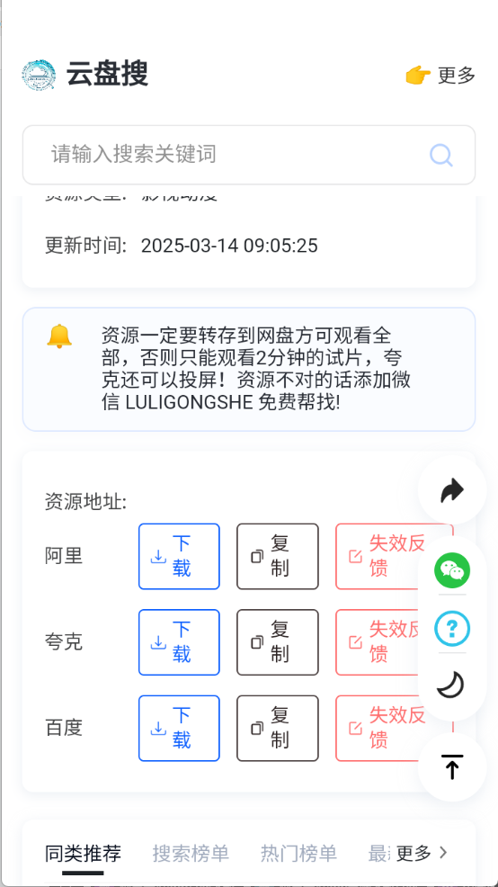 云盘搜是一个资源丰富的平台,涵盖热门影视、小说、学习资料等多种内容,支持多线路搜索功能,能快速为用户呈现大量资源;平台还会持续更新资源库,让用户随时随地都能找到所需资源。