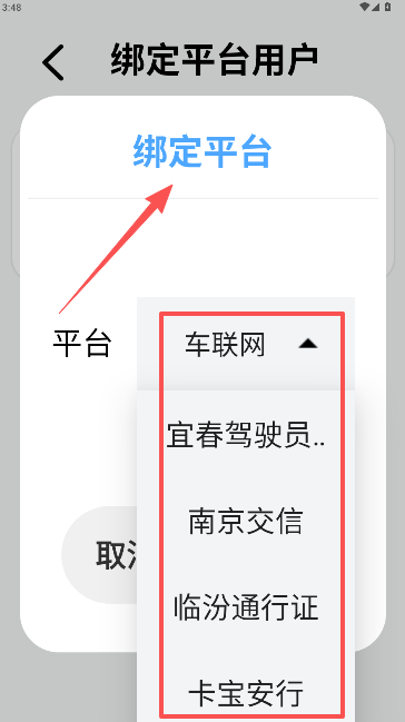 在首页的常用功能区域找到多车监控功能入口,根据页面提示绑定平台用户;接着点击三角形状的图标来展开平台列表,选中要绑定的平台后,继续补充填写相关账号信息,直至完成整个绑定流程。
