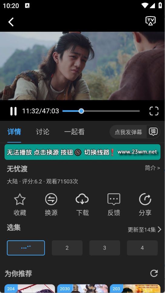 5、点开想看的影视,可可以看弹幕、切换播放源以及等。