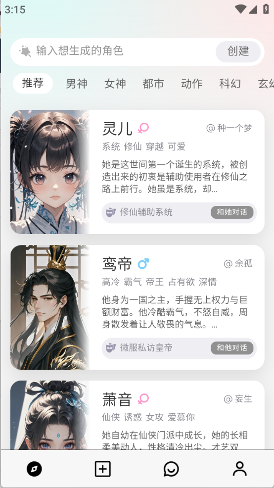 3、优质的人设随心聊天,这里有丰富的AI角色去挑选,自由去开启创建。